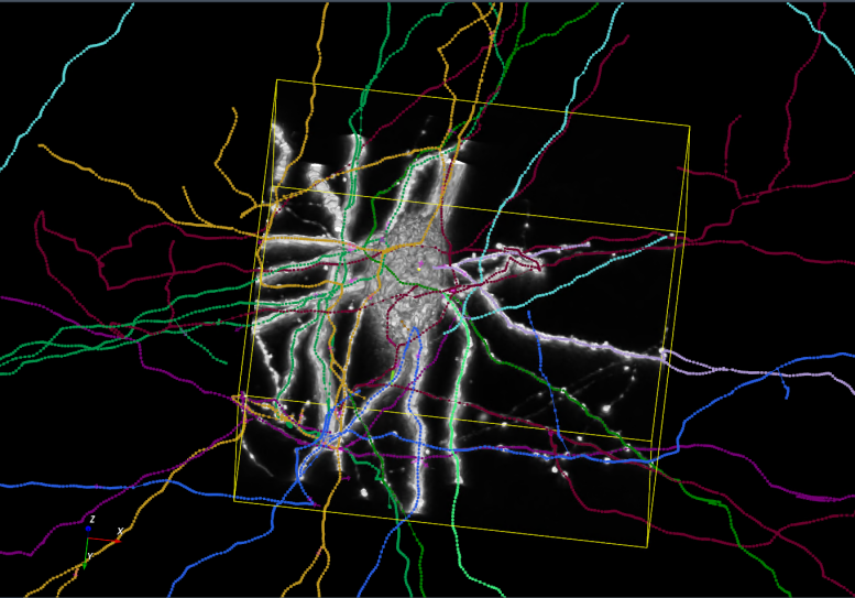 神经元由胞体+树突+轴突组成;我们需要确认胞体位置后,追踪树突、轴突,最终得到一条完整的神经元。树突有很多条且较短,轴突从胞体出发且只有一条,但很长且有很多分支。