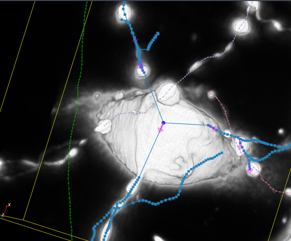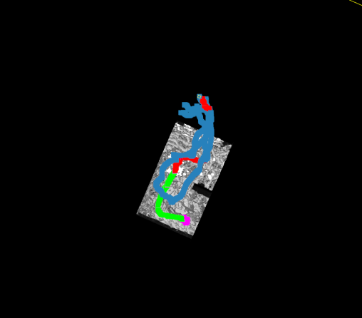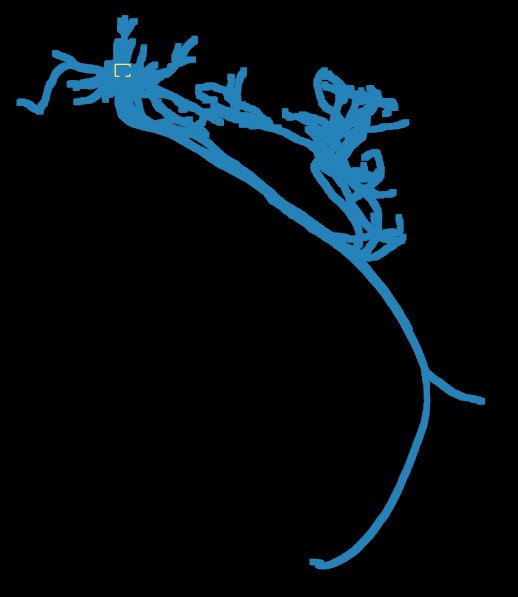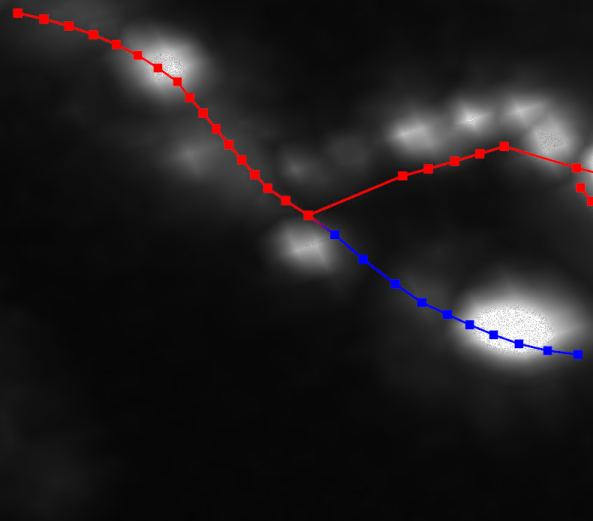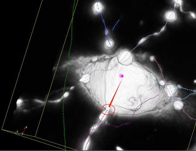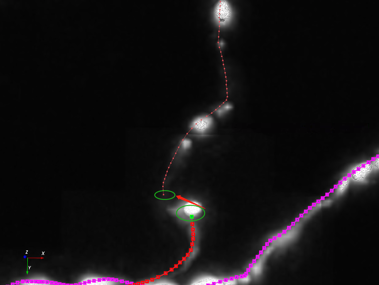 6、连接轴突树突,将胞体上的分支都连接到胞体上(按下Alt,同时鼠标右键选中主分支的点和需要连接的背景点,松下Alt合并成功),蓝色为前景,在蓝色上进行追踪。