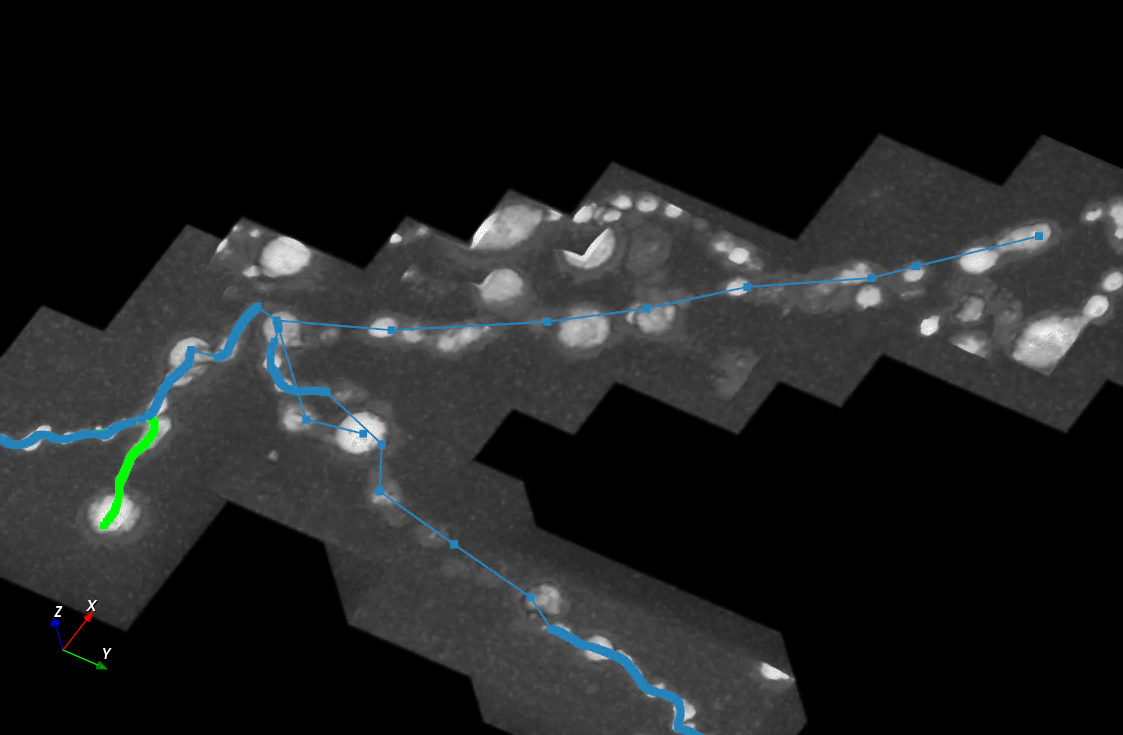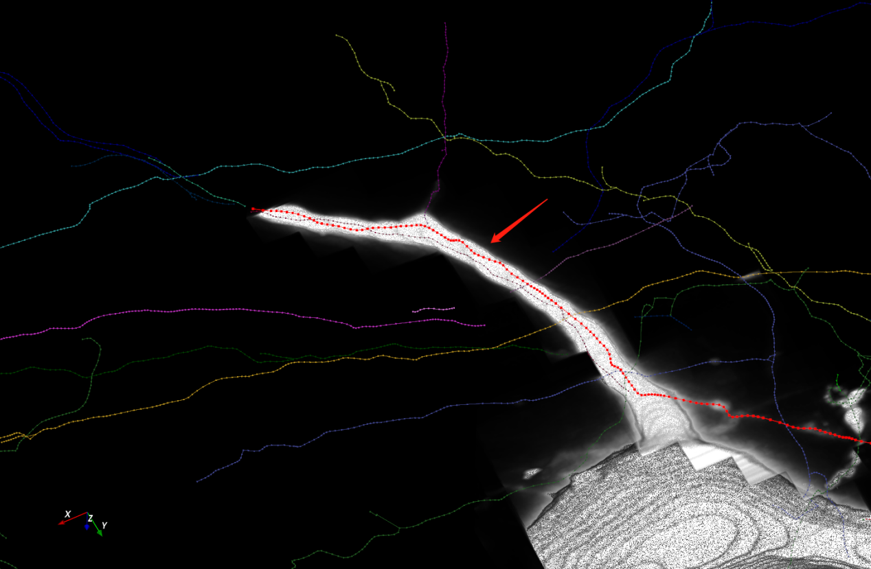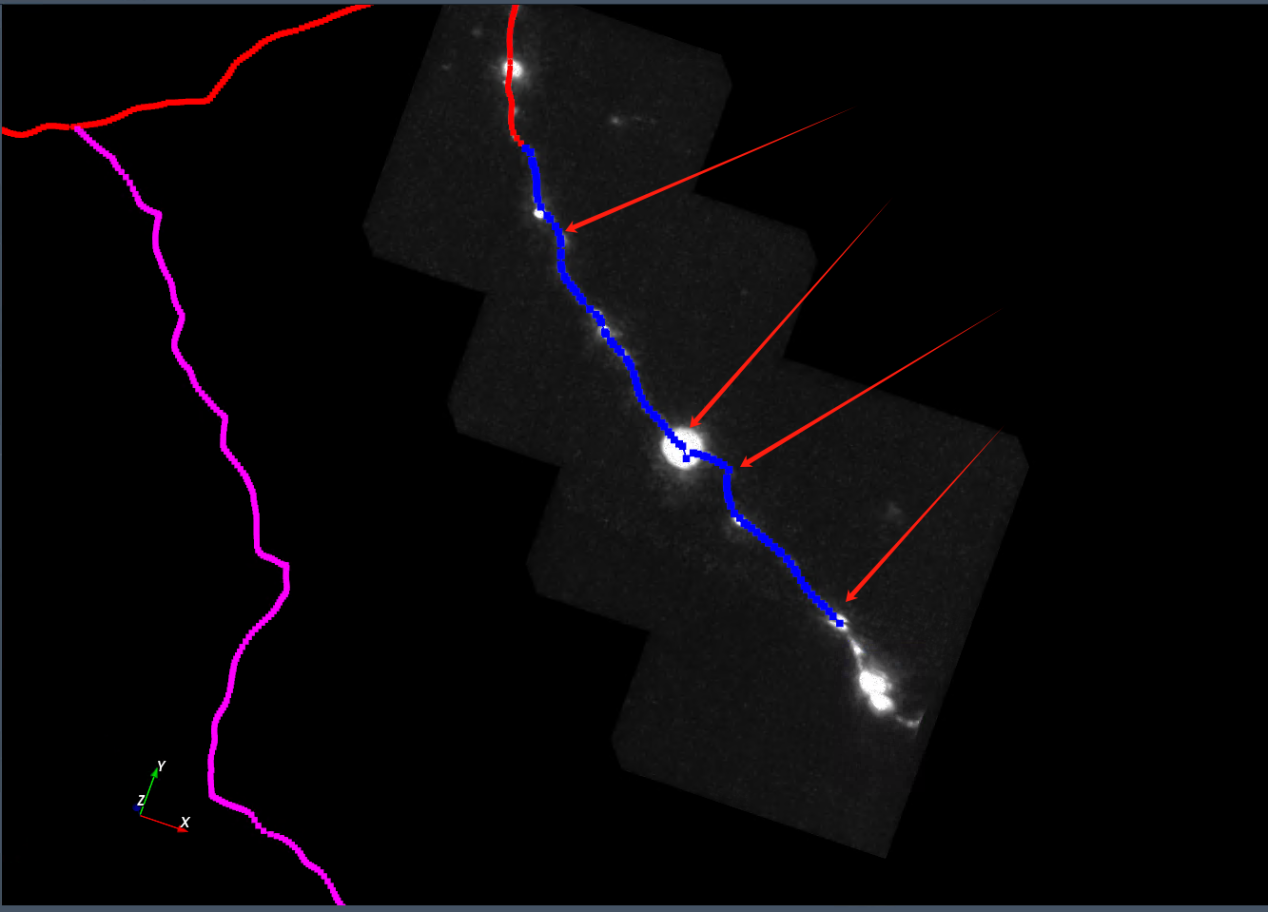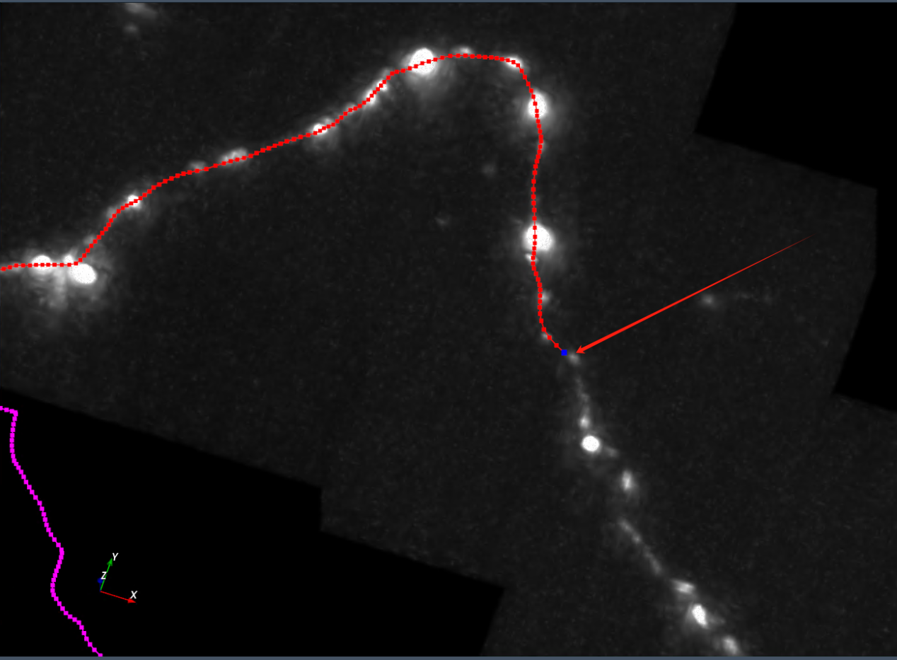 3、在2D模式下根据流向判断神经元的走向,鼠标左键点击,将会出现一个蓝色的点,对应的3D模式下也会显示。撤回已经标记的点(Ctrl+Z)
