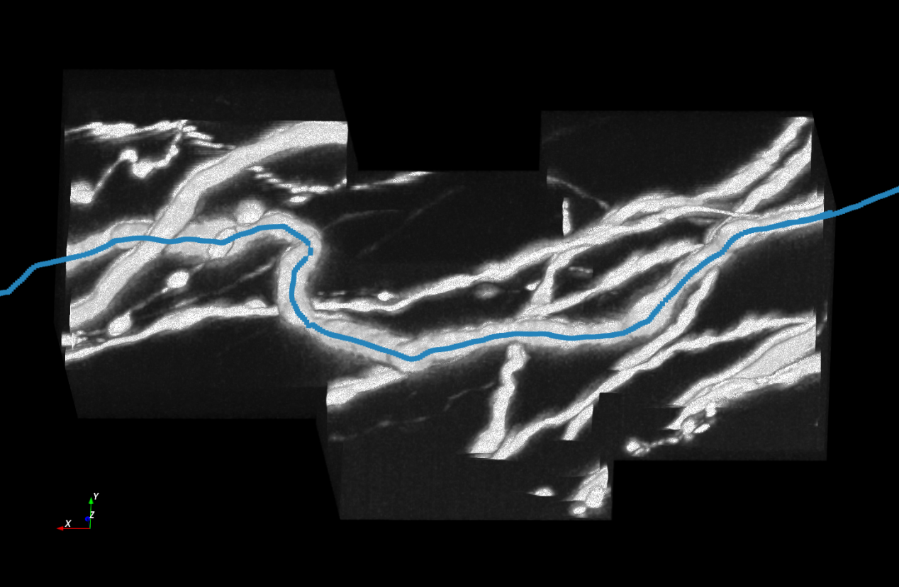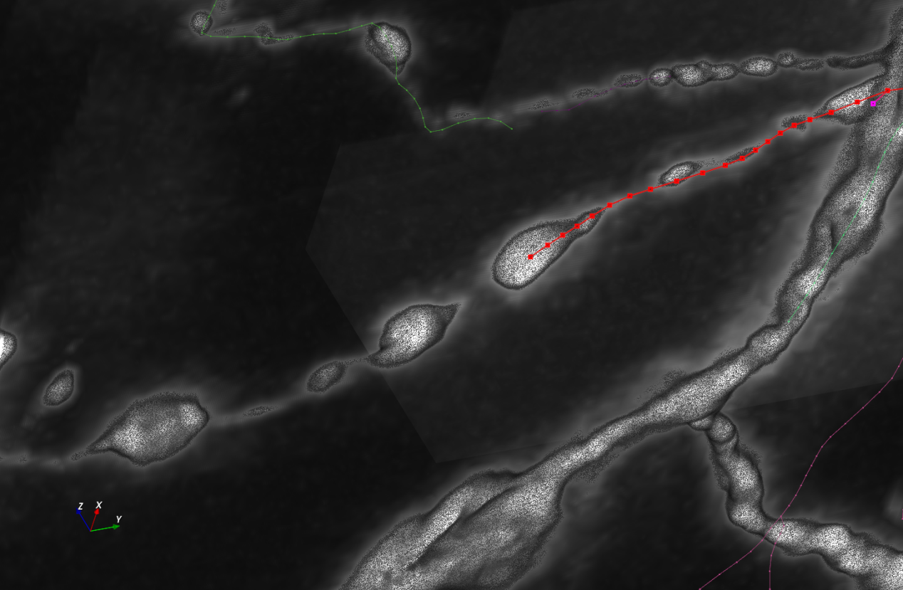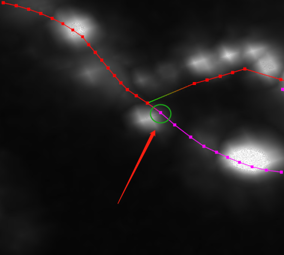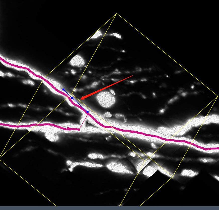 1、若确认是一根神经元上的纤维;就将其合并;“Alt+鼠标左键(选中二个点)”,松下Alt后,合并纤维(合并后纤维从背景变成了前景);