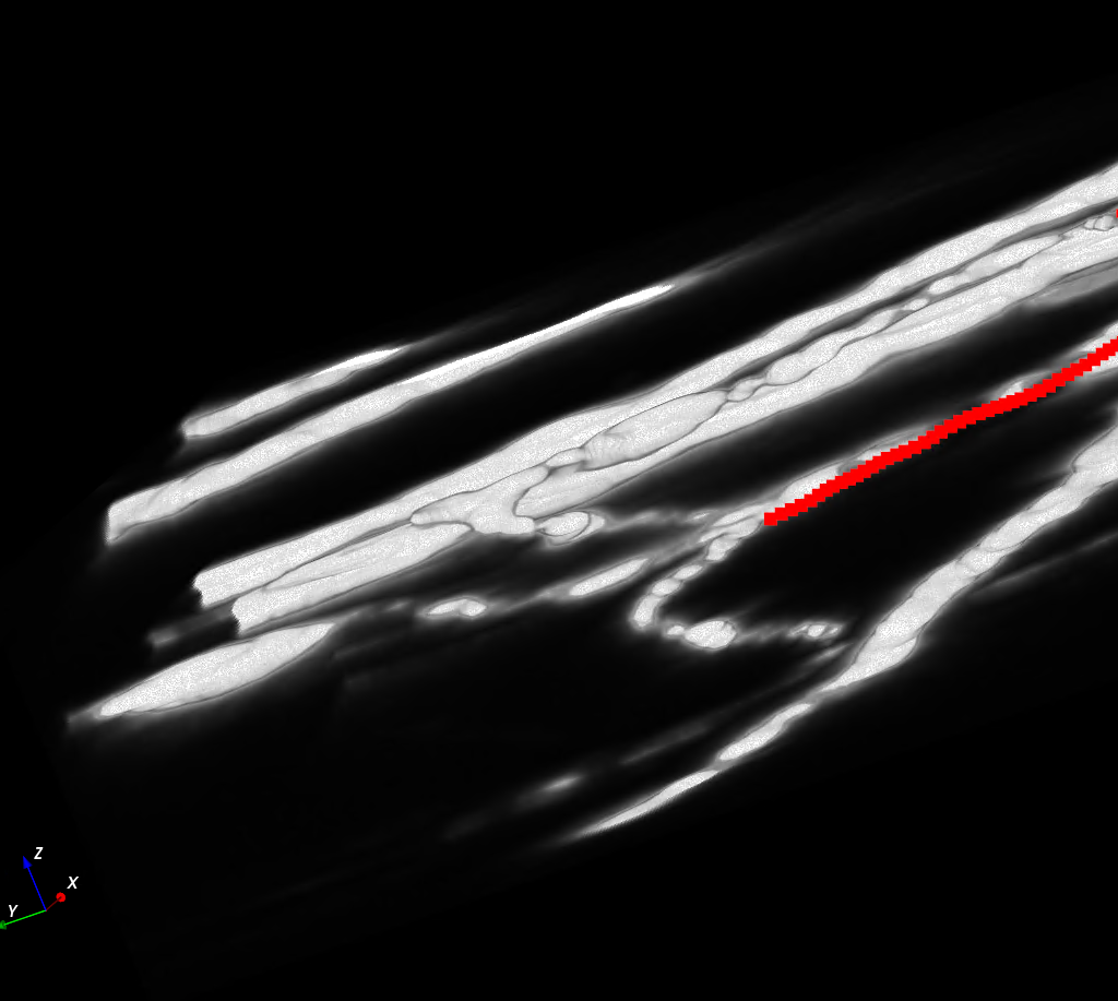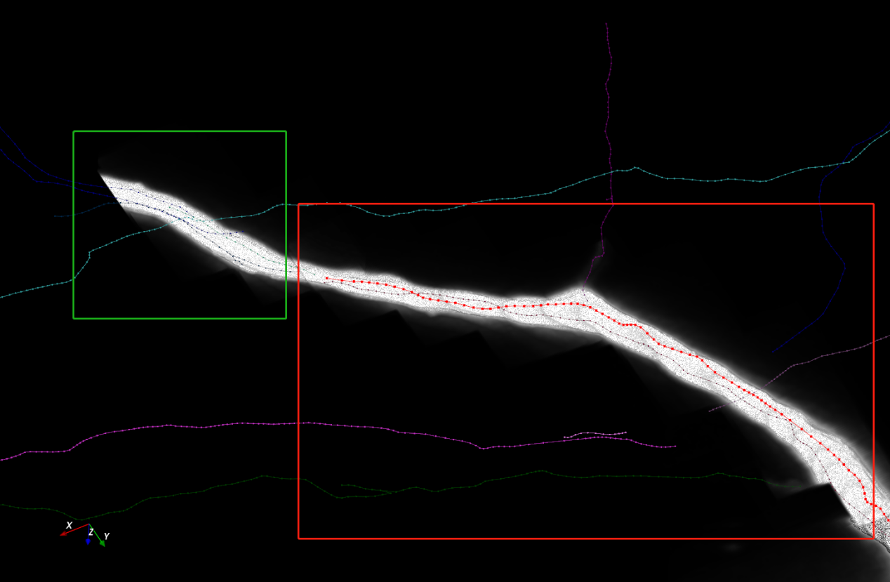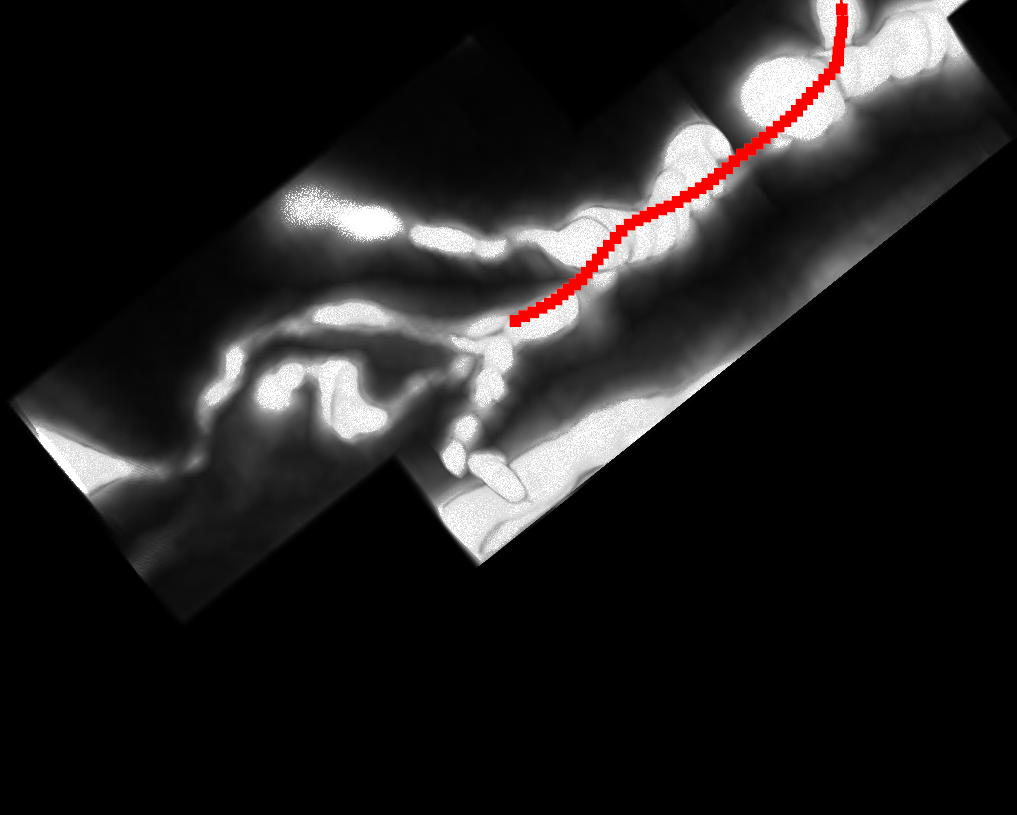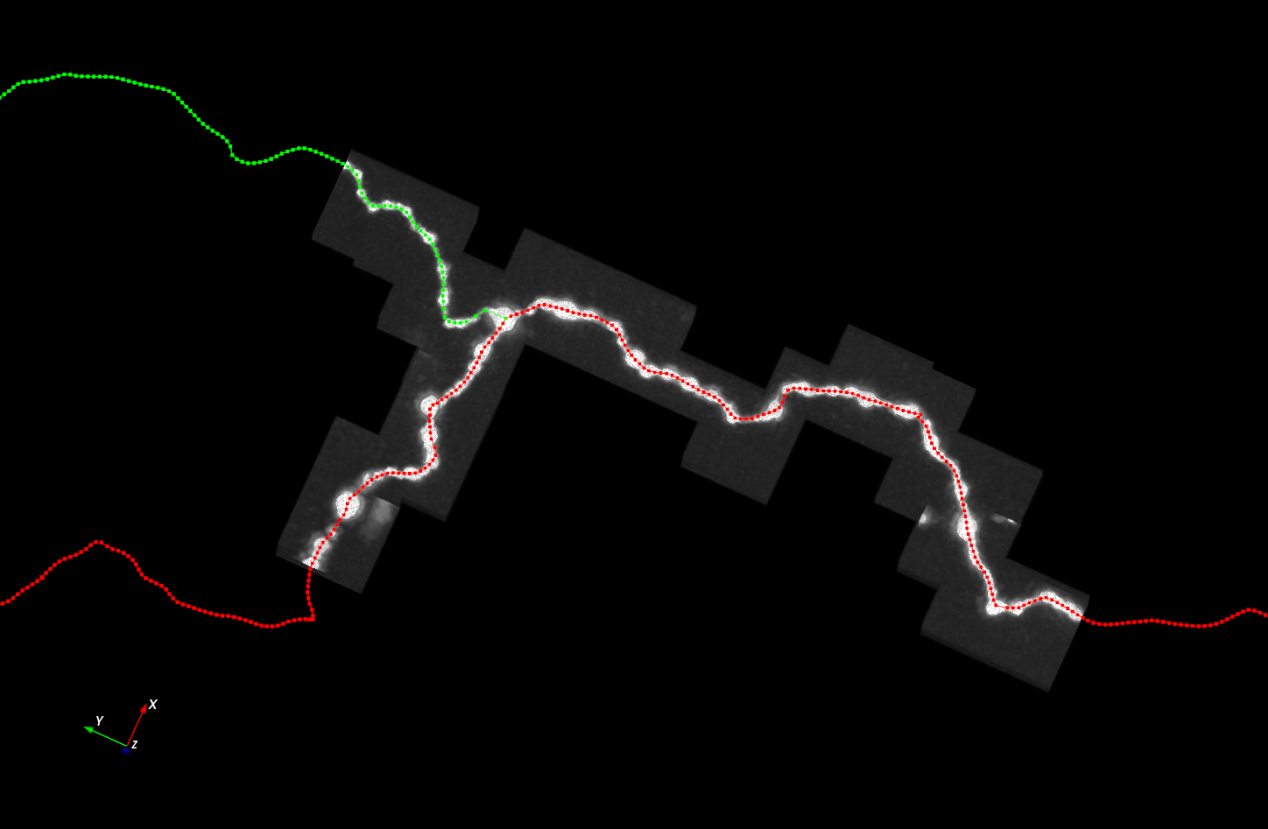 1、若确认是一根神经元上的纤维;就将其合并;“Alt+鼠标左键(选中二个点)”,松下Alt后,合并纤维(合并后纤维从背景变成了前景);