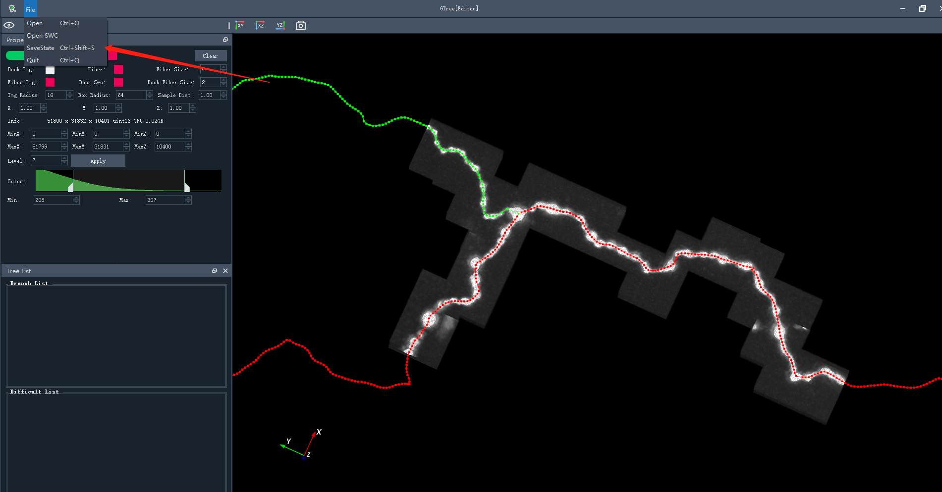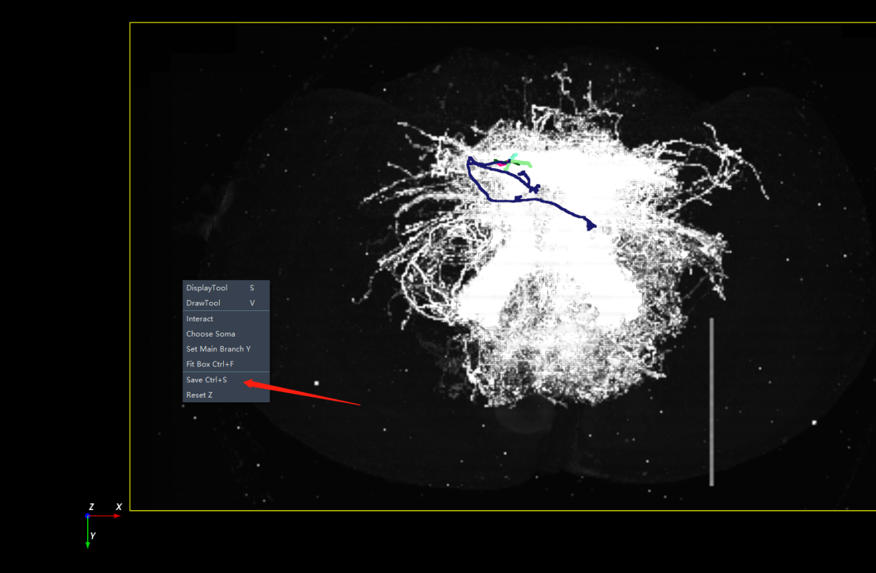 2、保存swc;在可视化区域单击鼠标右键,点击Save Ctrl+S(快捷键“Ctrl+S“);下次打开将是一整条纤维;没有保存相关标记点及上一次追踪的状态。